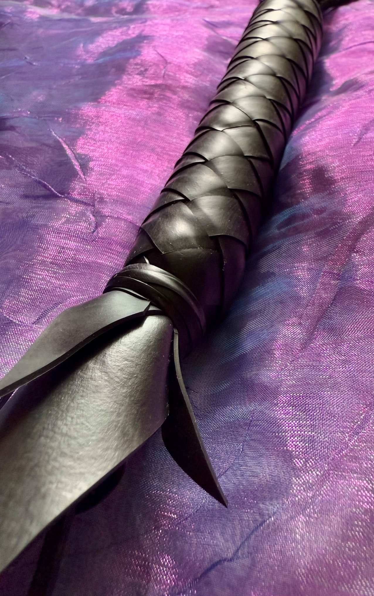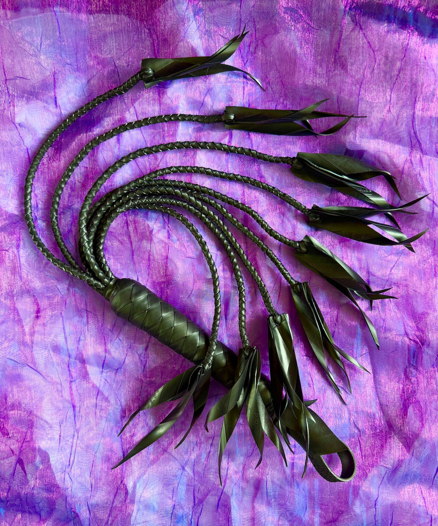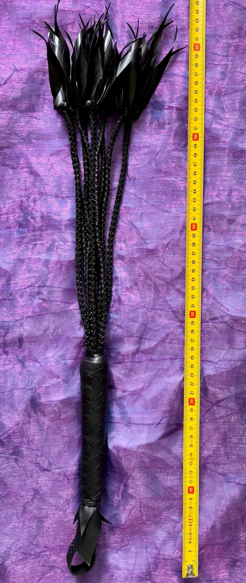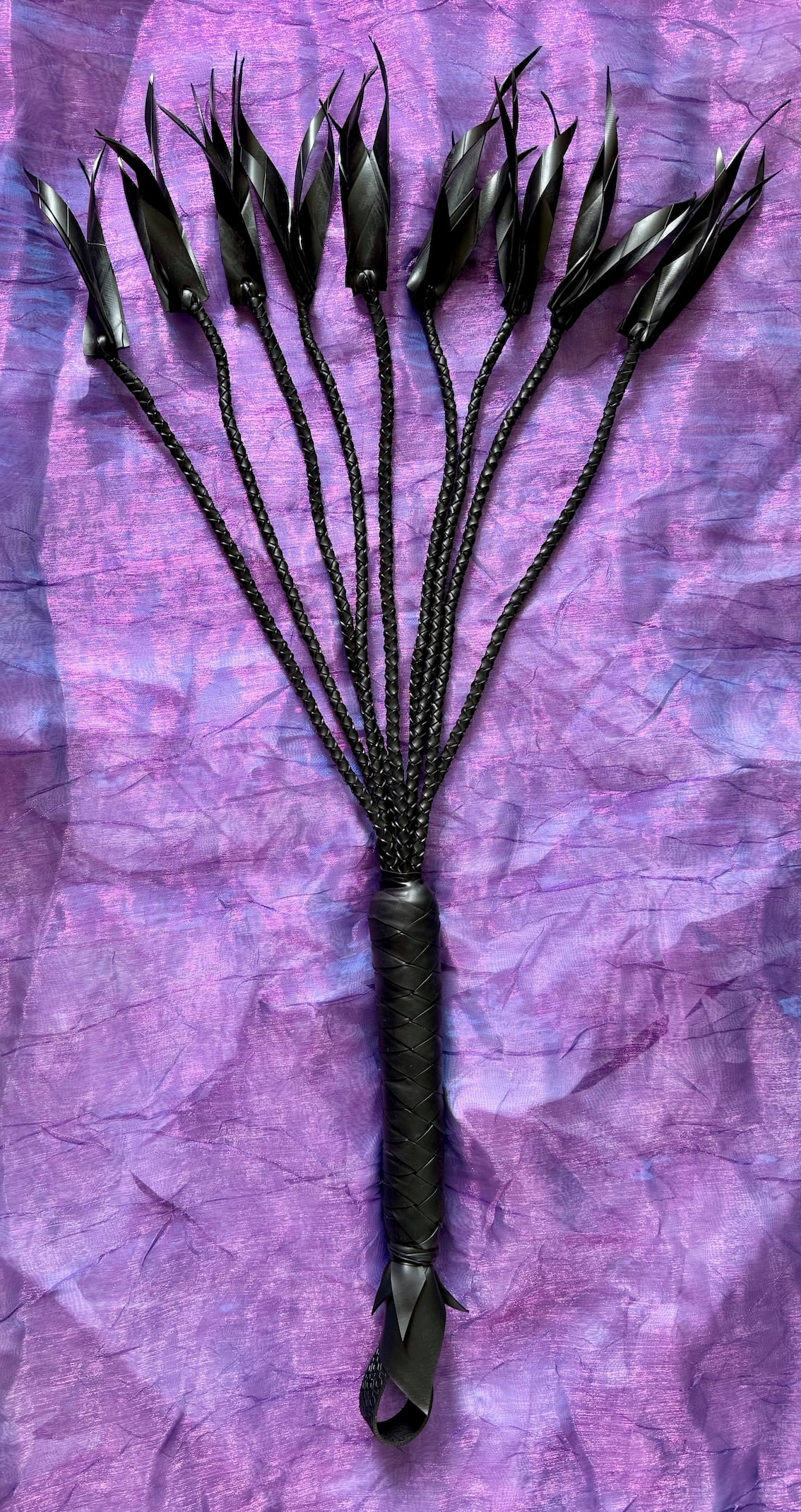 Cat ‘O’ Nine Bias cut rubber Flogger with 36 bias cut curled shards of sting. Free Delivery within Australia